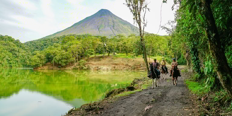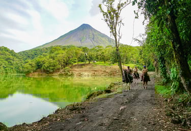 A guided horseback ride near Arenal Volcano, crossing rivers and rainforest trails with panoramic views of the volcano and surrounding jungle. Along the way, there is a chance to spot monkeys, toucans, and other birds.