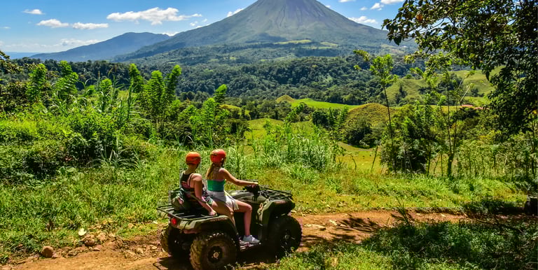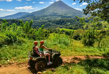 Ride ATVs through rainforest trails and rivers with panoramic volcano views. Includes a visit to the Arenal River and a cultural stop at the Maleku Indigenous community. Driver’s license required.